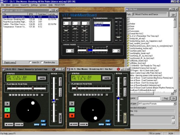 I was still sceptical and decided to meet the man behind the fantastic music I kept hearing. Digital Liquid (Steve) showed me the program and how it works and I'm now a believer in his raw talent. Mixing with Virtual Turntables allows him to take the art of being a DJ to a higher level. The music library becomes infinite since it utilises the latest in MP3 technology. With this technology, he's able to gather music from virtually any source be it the internet, MP3s files, or purchased music compact discs (ripped into an mp3 file format) and take his record bag with him, not in crates of records, but in a single jewel case. All he needs is a computer when he performs. And what other DJ but this type could financially afford to have such an extensive music library at his fingertips or be able to play continuously for potentially over 48 hours? He's a one-man rave!! With the advent of broadband availability, the opportunity to download mp3 files, whilst live mixing, is achievable. Provided the internet could provide the required track for download, the DJ of tomorrow will be able to meet any request or wish of clubs/promoters by having access to millions of files, world wide, live and in the mix.